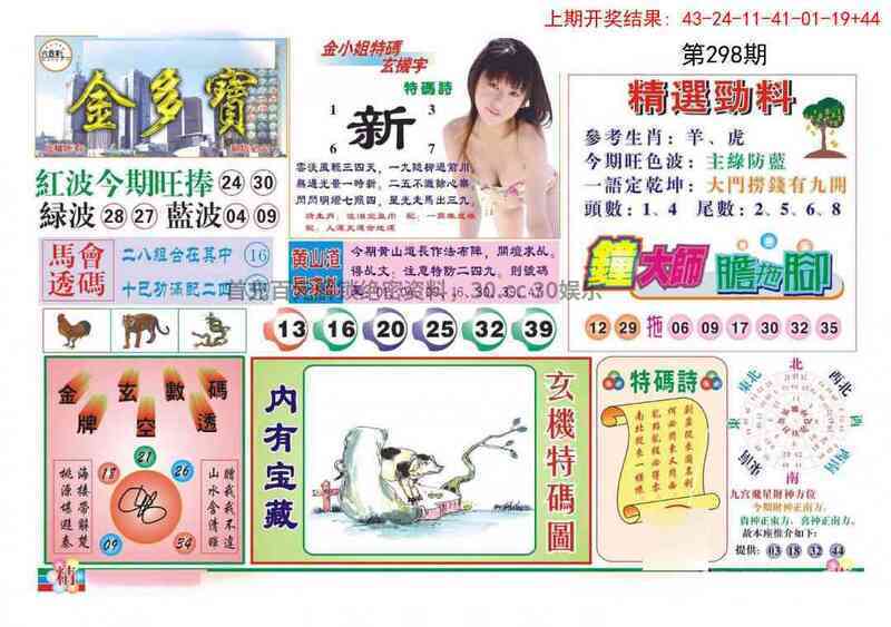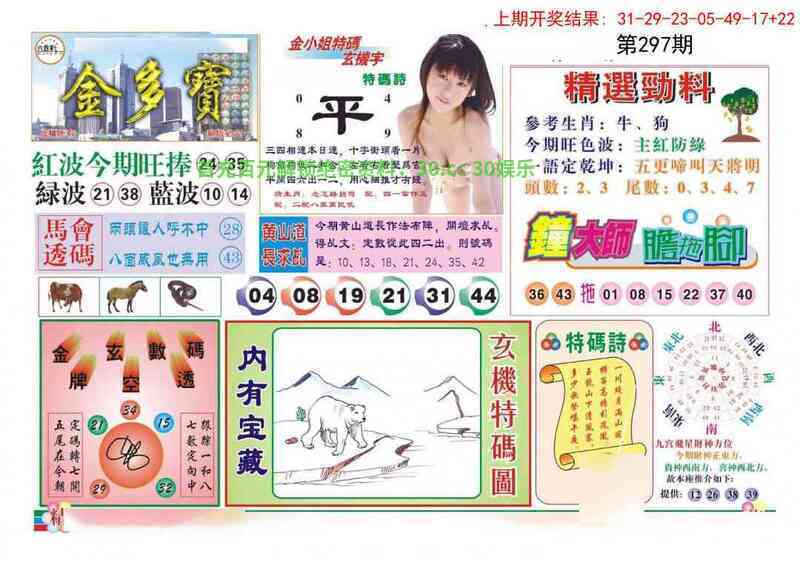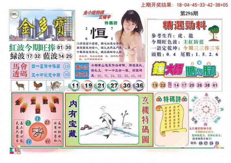 | 297期:金多宝 解:图中一语定乾坤可解天命加身的生肖,虎龙蛇鸡狗马 综合:虎龙蛇鸡狗马 防特:21.33.32.44.12.24 |