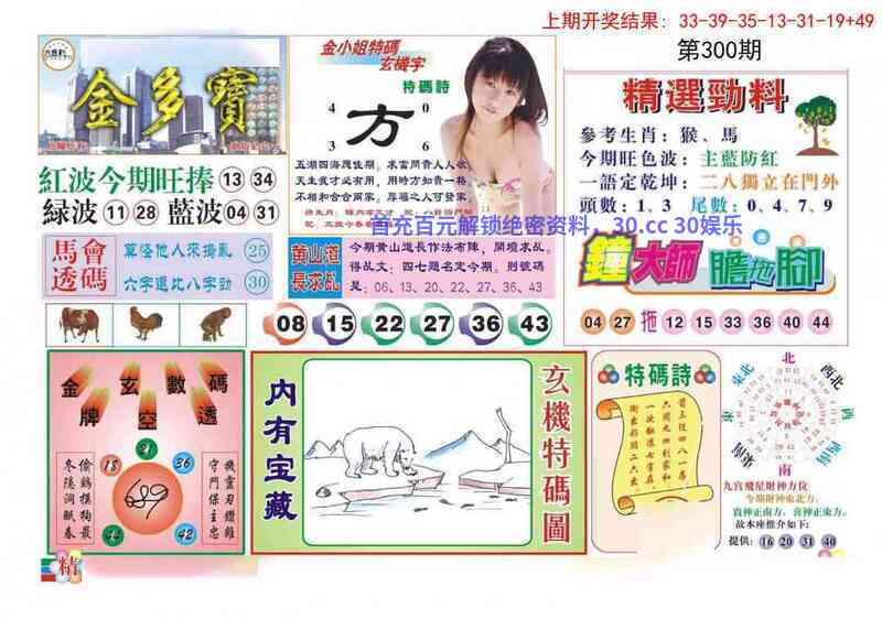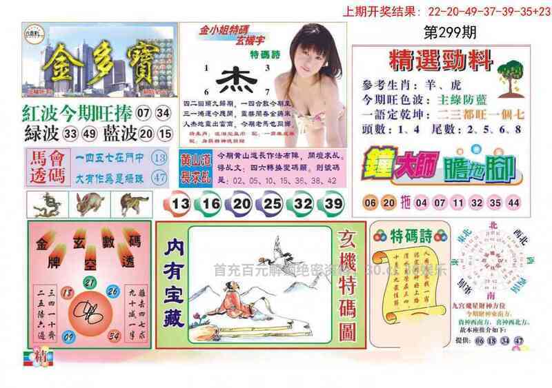 | 300期:金多宝 解:图中一语定乾坤可解平步青云的生肖,龙马猴蛇狗虎 综合:龙马猴蛇狗虎 防特:13.37.20.44.28.40 |